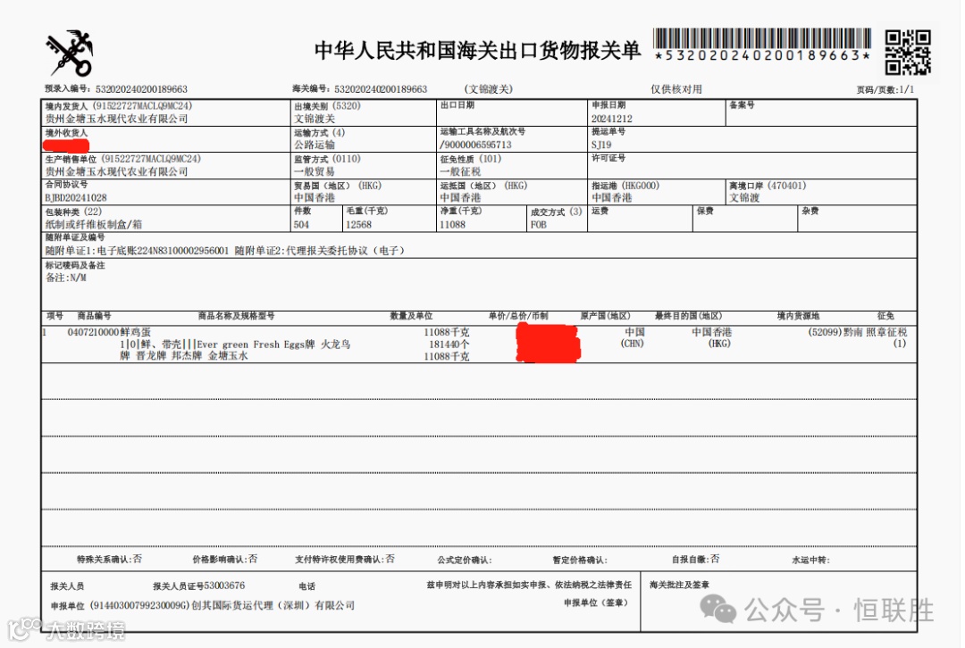 近日,黔南州平塘县鲜鸡蛋成功踏上出口香港之旅,这一成果背后,恒联胜外综服服务有限公司全力推动发挥了关键作用。