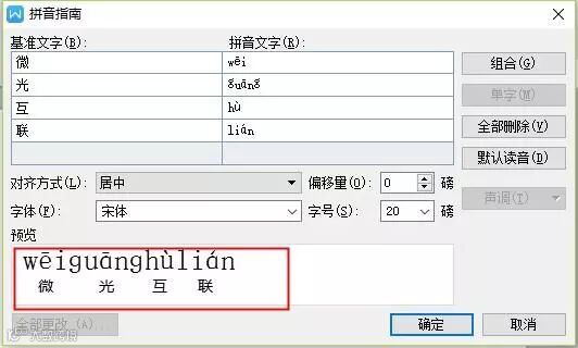②然后会弹出一个窗口,我们可以在下方的预览里看到已经标好拼音的文字,点击确定,带拼音的文字就已经插入到我们的文档中了。