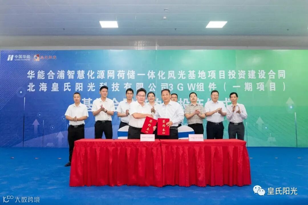 仪式上,中国华能集团有限公司广西分公司总经理、党委副书记曹国强与合浦县人民政府副县长骆远栋在华能合浦智慧化源网荷储一体化风光基地项目投资建设合同签约本上签字。