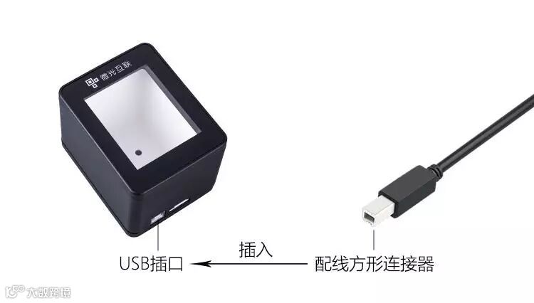 如果您没有看到输出信息或者还有其他需求,您需要根据自己的情况进行配置。取出产品配置用线,将USB 接口配线方形的一端插入扫码器底部的USB接口,如图