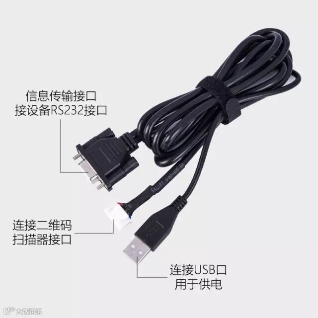 将RS232产品标准配线的白色接口线缆一端与扫码器连接,将线缆的USB端与电脑USB口连接,另一端与电脑上的RS232接口或者USB转接出的RS232接口连接(即我们上面说的转接线的RS232公头)。