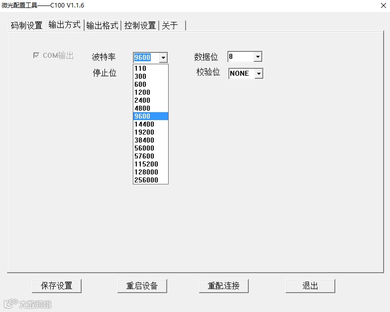 c . 在【输出方式】里,确认是否选择了【COM 输出】,波特率、数据位、停止位是否和使用机器一致