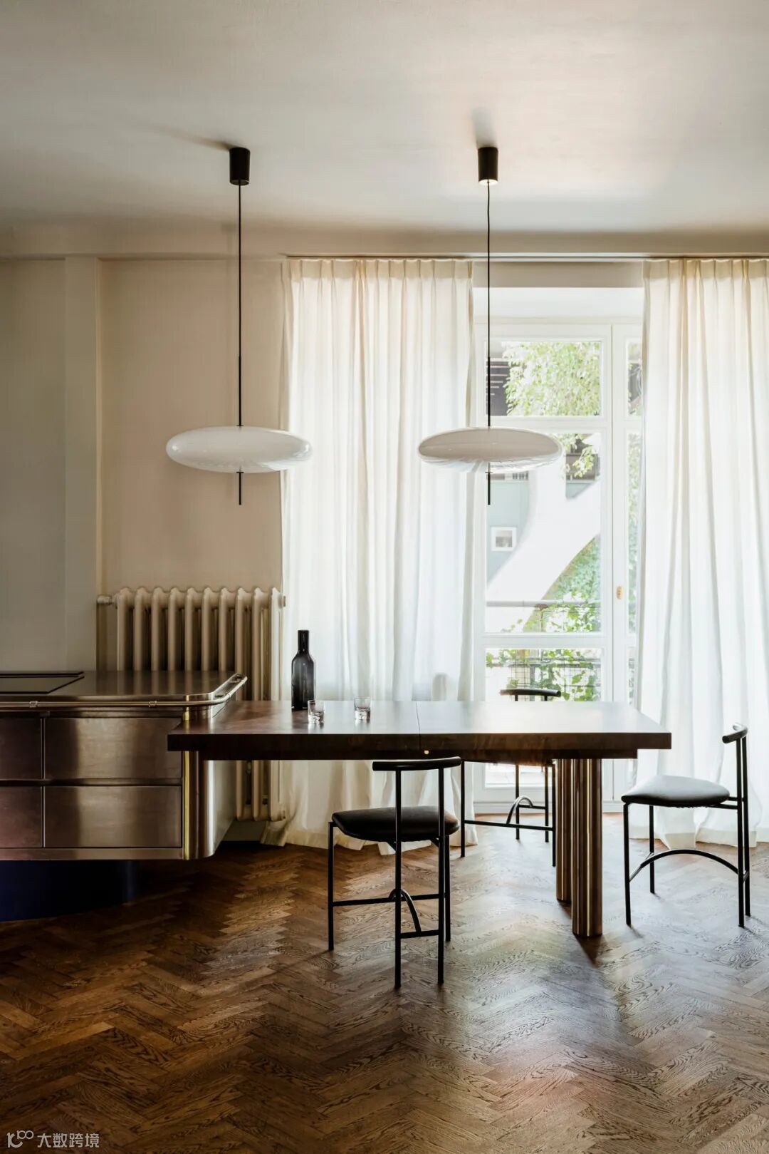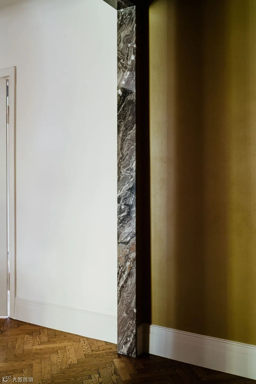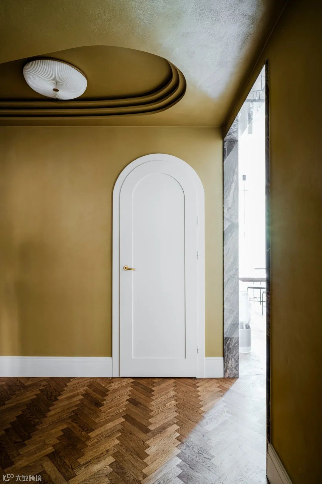 在玄关的采光不足的背景下,地板、大理石、拱形门格外引人注意,橡木人字纹的现代、简约,反而是复古且具有侵袭感。