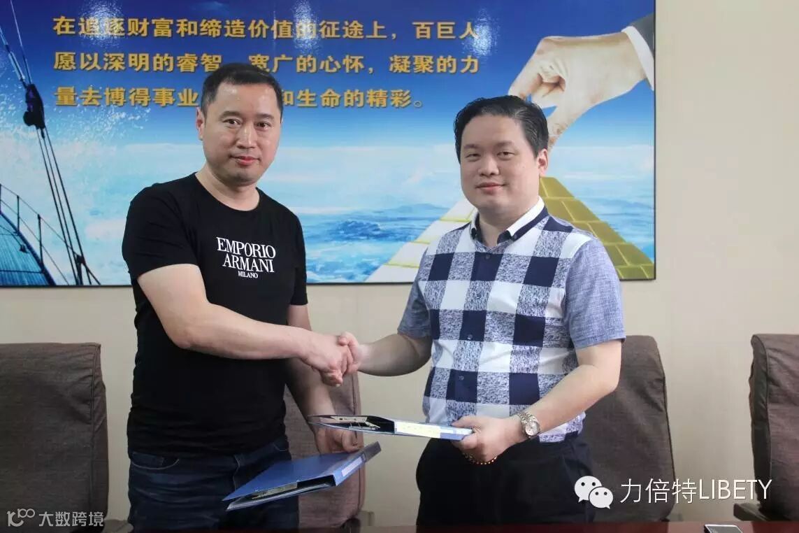 力倍特(中国)饮料有限公司董事长詹友何(右)和浙江四方缘商贸有限公司董事长余道勇(左)签约仪式后亲切握手。