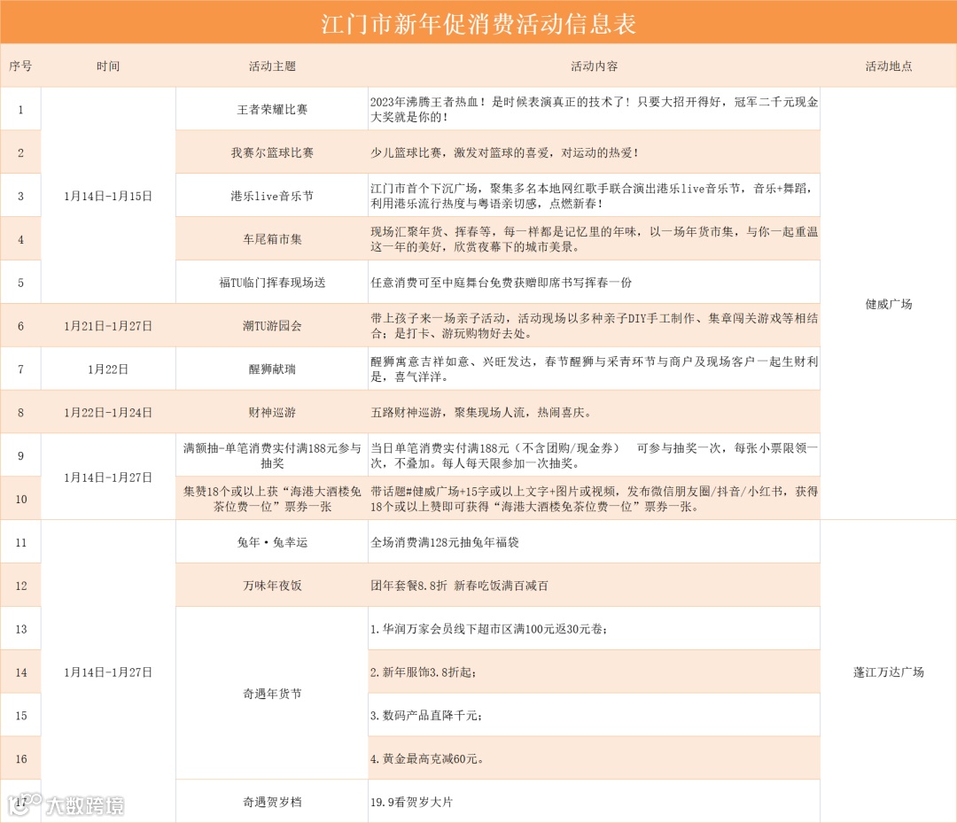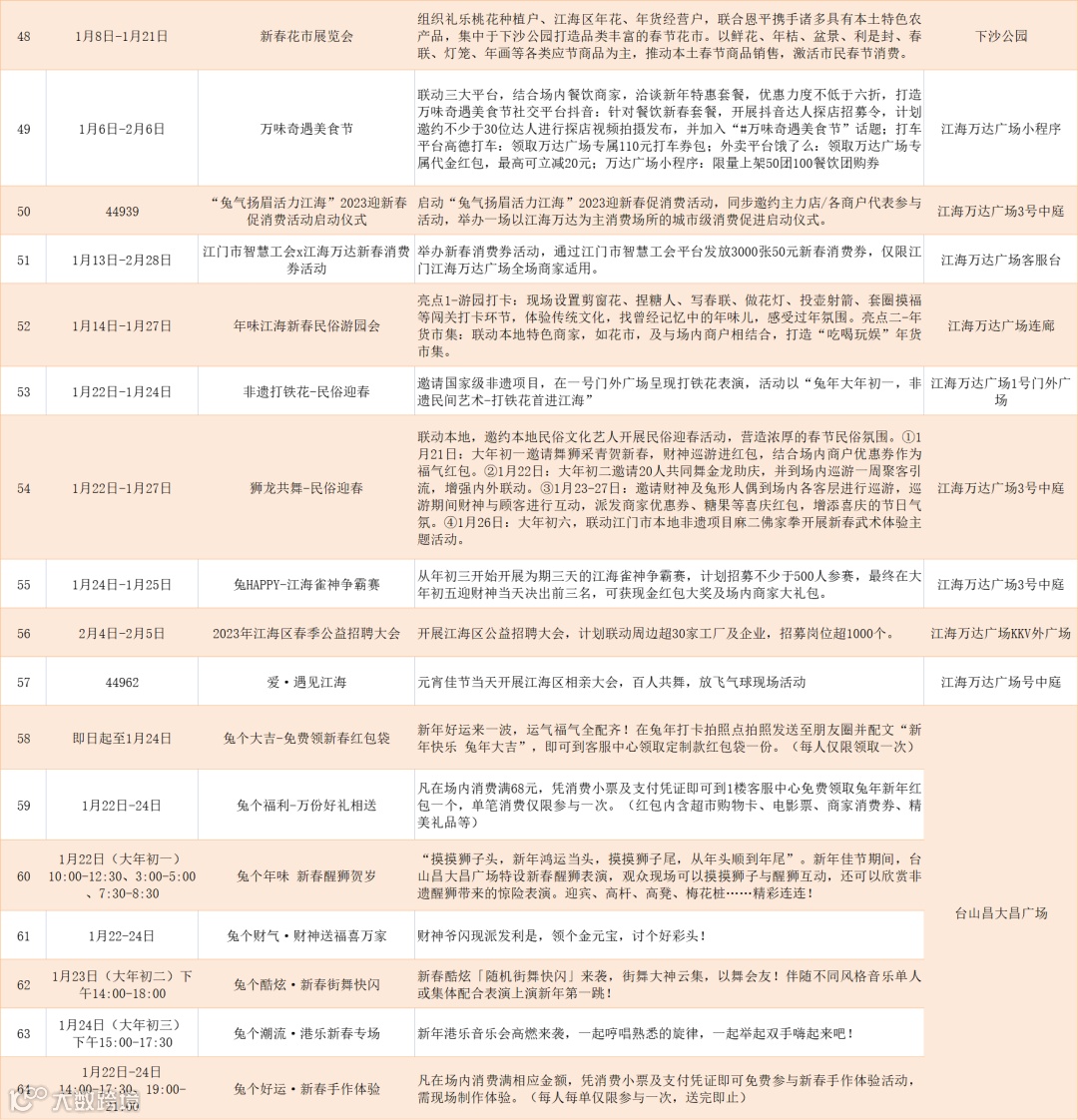 春节期间,我市将密集发放涉及零售、餐饮、住宿等行业的春节消费券。例如,江海区将举办“兔气扬眉 活力江海”2023迎新春促消费系列活动,分两轮发放总价值200万元的惠民消费券。台山市安排25万元,向50强企业的留台过年外来务工人员发放总价值200元的消费券。恩平市开展购车补贴活动,2月20日前,消费者在恩平市购买汽车、摩托车以旧换新、电动自行车的消费者可享受相关补贴。其中,对新购买小汽车,每台给予1500元-4500元购车补贴;对摩托车以旧换新,每台给予750元-850元购车补贴;对新购电动自行车,每台给予270元补贴。新会区于1月6日至1月31日,在扬航电商科技产业园举行“2023新会区电商年货节”,发动各大电商平台、品牌企业创新推出“美味舌尖”“品质生活”“互动探索”等多个线上消费场景矩阵,举办具有本地区域特色的年货直播专场,营造春节期间“乐享新会”的浓厚消费氛围。台山市将举办“美好生活,乐在台山”——台山市2023年春节促消费活动,搭建“台山优生活”线上平台,聚合各大商圈、车企、制造业企业等商家优惠信息,线上举办丰富多彩的直播活动,并联合商家举办春节促消费系列活动。