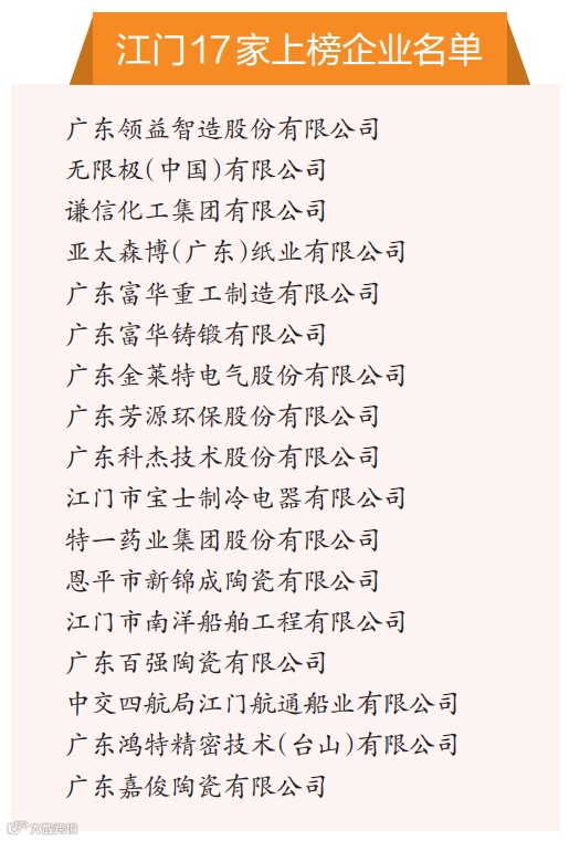 广东省制造业500强企业是全省规模以上制造业的领头羊,带动着整个行业以及产业链的发展,是全省制造业、区域经济企稳及持续发展的主力军。报告显示,此次我市上榜企业中,广东领益智造股份有限公司、无限极(中国)有限公司、谦信化工集团有限公司、亚太森博(广东)纸业有限公司4家企业入围100名之内。