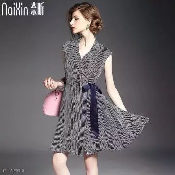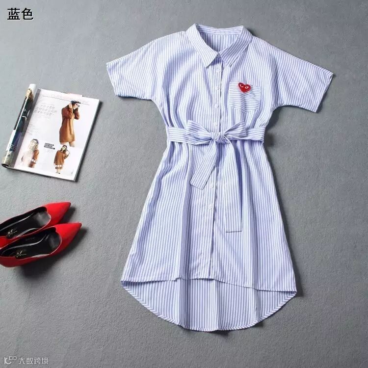 衬衫裙,120元。纯棉面料,舒适透气,经典蓝白条纹,干净清爽,腰部系带,突出腰线。