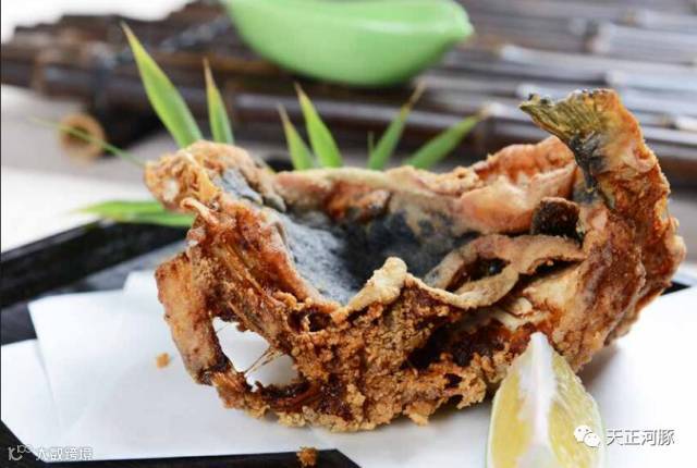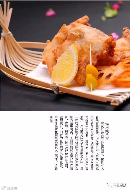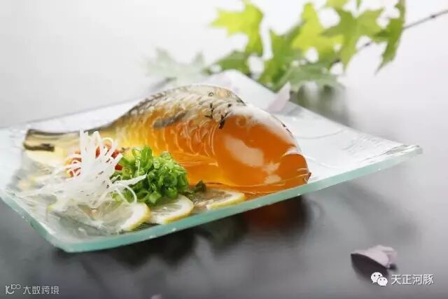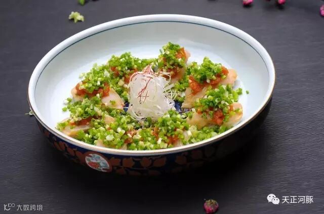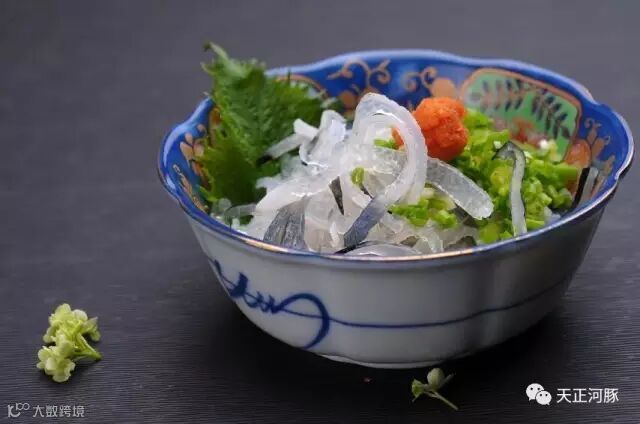 河豚前菜最为代表性的是醋拌河豚鱼皮,河豚鱼皮去刺后,能食用部分的出品量只占鱼体重的3-4%,不含脂肪,全部为胶原蛋白,是女性保养圣品,在日本也是很多化妆品的原料。河豚鱼皮经过处理后与萝卜泥凉拌,清爽可口有弹性,加之日本特制橙醋的酸甜味,简直停不下来。