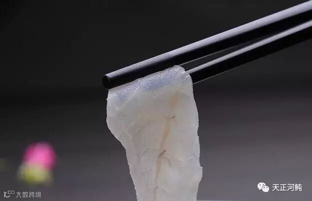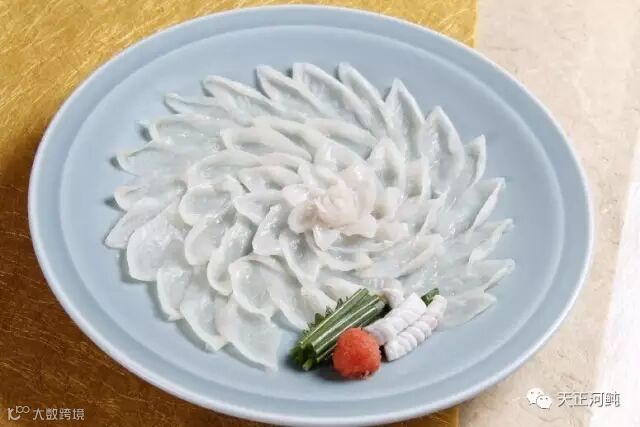 片制河豚刺身最好选用一斤左右的河豚,所用鱼肉要提前一天用布包裹好以去除多余的水分,包裹鱼肉的和布来自日本制作和服的老店。片制河豚的刺身刀要比普通的刺身刀更加柔韧,一柄出色的河豚刺身刀大多出自专业打制武士刀的匠人之手。食河豚刺身的作料有三:橙醋、辣萝卜泥和小葱。其中橙醋和萝卜泥都来自河豚师傅的秘制,被誉作河豚料理的魂魄。