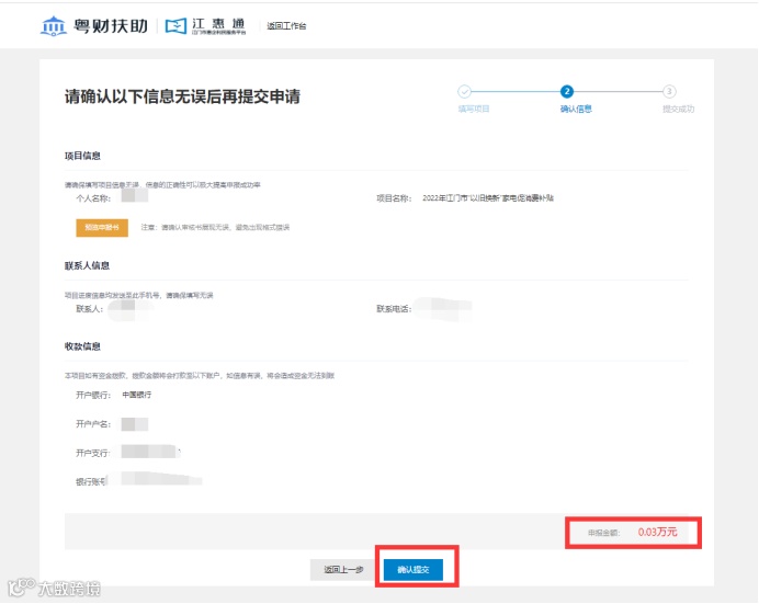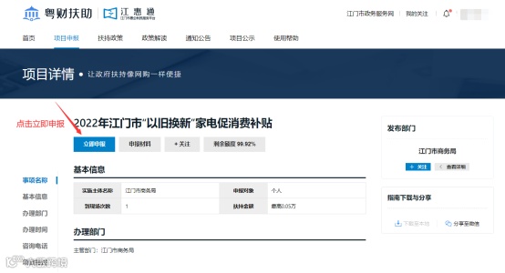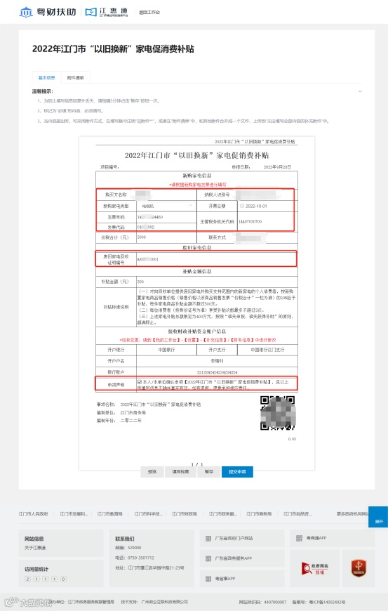 登录“江惠通”平台,点击进入“2022年江门市‘以旧换新’家电促消费专项活动”申领入口,填写《2022年江门市“以旧换新”家电促消费专项补贴申请表》,并拍照上传《废旧家电回收证明》、废旧家电照片、新家电销售发票、交易凭证(销售小票、POS机小票、电子支付凭证截图、现金收据等)、新家电照片、消费者同名的银行账户,并由消费者本人确认信息无误,勾选申领声明后,即可一键完成申报提交。