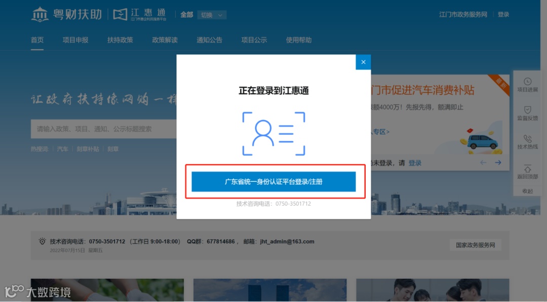 符合条件的个人消费者可以登录“江惠通”平台(网址:https://jht.jiangmen.gov.cn/#/home)进行申报,点击【个人登录】,通过“粤省事”人脸识别注册登录,完善个人信息资料。