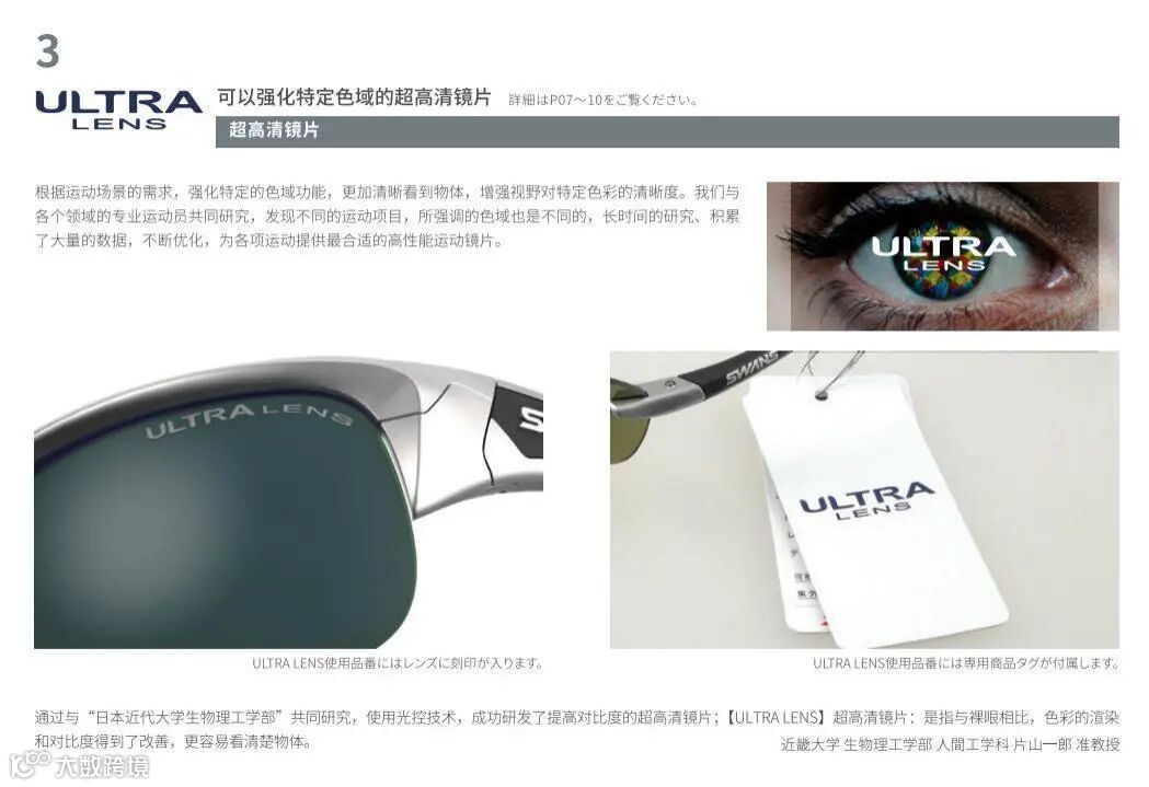 炫彩:专利级光学技术支持——SWANS FIT-P偏光镜片采用一体成型偏光技术,一镜滤除漫反射光;ULTRA lens高清镜片指向性增强色彩,为胜利导航。