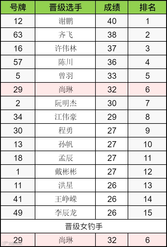 紧跟其后的是获得第4-6名的陈川、曾羽、尚琳,获得第7-10名的选手分别为阮明杰、江伟豪、程勇、孙帆,获得第11-15名的选手为孟辰、戴彬彬、洪星、王峥嵘、李辰龙,最后获得16-20名的选手为胡亮、段晶、魏文龙、张强、孟青。