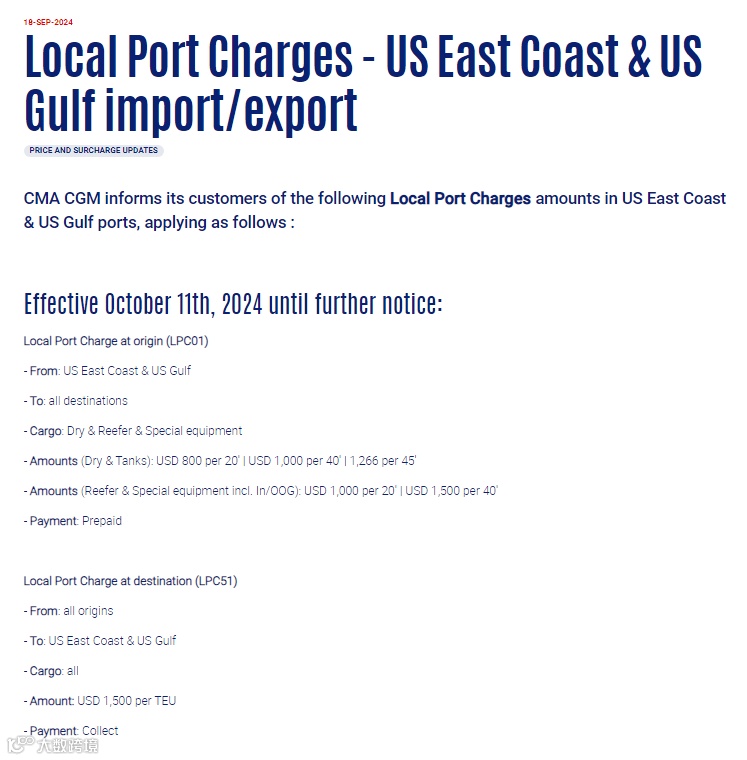9月18日,达飞轮船宣布,自10月11日起,对进口至美国东部和墨西哥湾沿岸的货物收取每标准箱1500美元的港口费用,而出口货物则自同日起加收每20英尺800美元和每40英尺1000美元的当地港口费用。