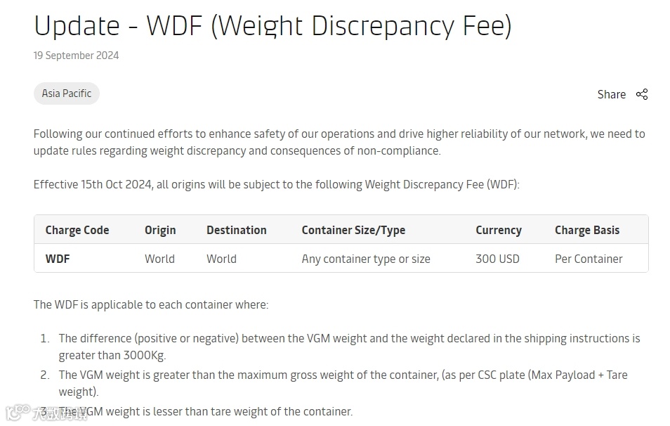 9月19日,马士基发布公告宣布,自2024年10月15日起,所有出发地均须缴纳重量差异费 (WDF),每个集装箱 300 美元。