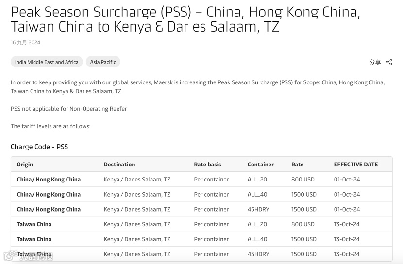 9月16日,马士基发布公告宣布,将于10月1日起,上调中国大陆、中国香港至肯尼亚和坦桑尼亚达累斯萨拉姆所有航线的旺季附加费(PSS);从10月13日起,上调中国台湾至肯尼亚和坦桑尼亚达累斯萨拉姆所有航线的旺季附加费(PSS)。