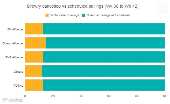 根据德鲁里9月13日发布最新数据,主要东西向航线中,接下来的第38周(9月16日至9月22日)至第42周(10月14日至10月20日)期间,共有90个航次被取消,取消率为13%。