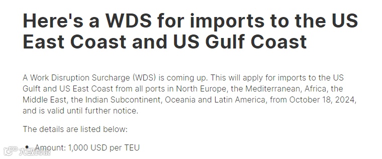 9月18日,赫伯罗特也宣布,对从北欧、地中海、非洲、中东、印度次大陆、大洋洲和拉丁美洲所有港口,至美国东海岸和墨西哥湾沿岸的货物,收取“工作中断附加费”(WDS),收费标准为1000美元/TEU,生效日期为10月18日。