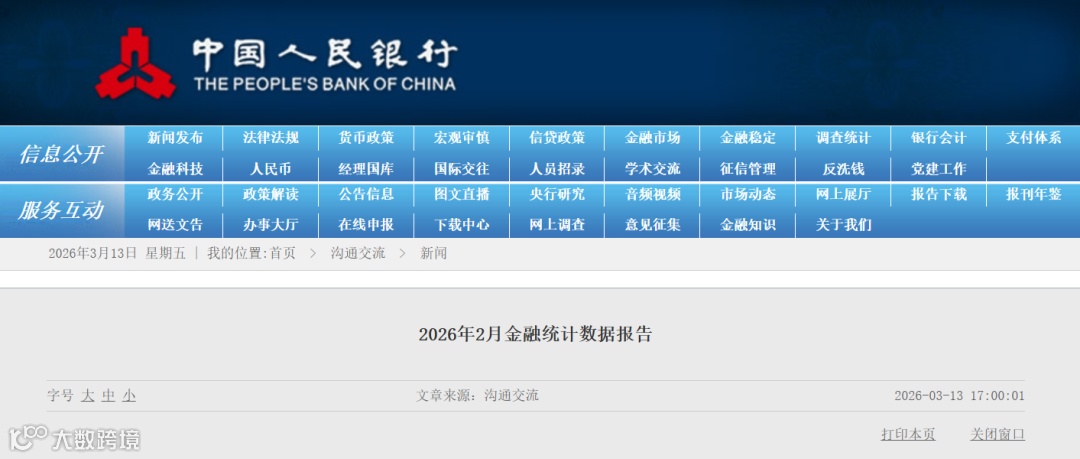 初步统计,2026年2月末社会融资规模存量为451.4万亿元,同比增长8.2%。其中,对实体经济发放的人民币贷款余额为274.15万亿元,同比增长6.1%;对实体经济发放的外币贷款折合人民币余额为1.08万亿元,同比下降11%;委托贷款余额为11.28万亿元,同比增长0.3%;信托贷款余额为4.7万亿元,同比增长8.5%;未贴现的银行承兑汇票余额为2.6万亿元,同比增长12.9%;企业债券余额为34.84万亿元,同比增长6.2%;政府债券余额为97.3万亿元,同比增长16.6%;非金融企业境内股票余额为12.27万亿元,同比增长4.2%。