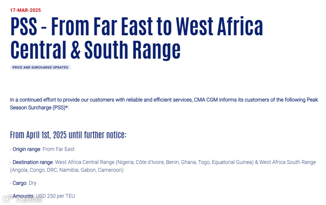 自2025年4月1日起,直至另行通知,来自远东至西非中部、南部的干货货物,征收 250 美金/TEU 的旺季附加费PSS。