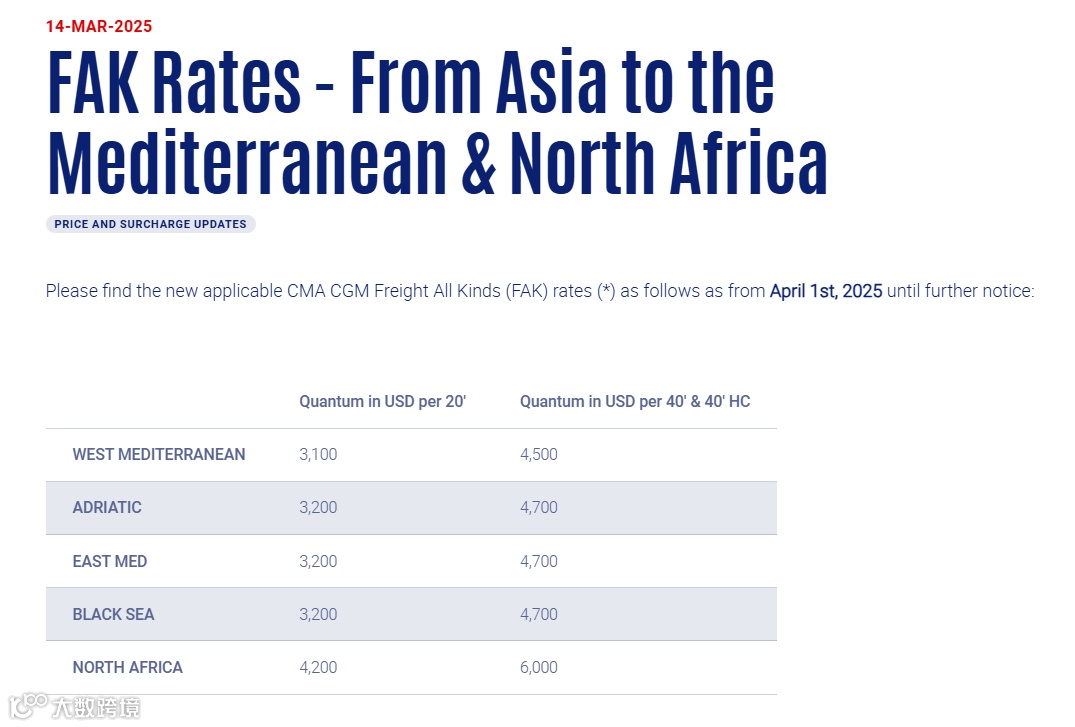 近日,达飞发布公告,宣布自2025年4月1日起,对所有来自亚洲主要港口运往地中海和北非港口的货物实施新的FAK费率,其中亚洲运往北非港口的大柜FAK费率将上涨至6000美元。详情如下: