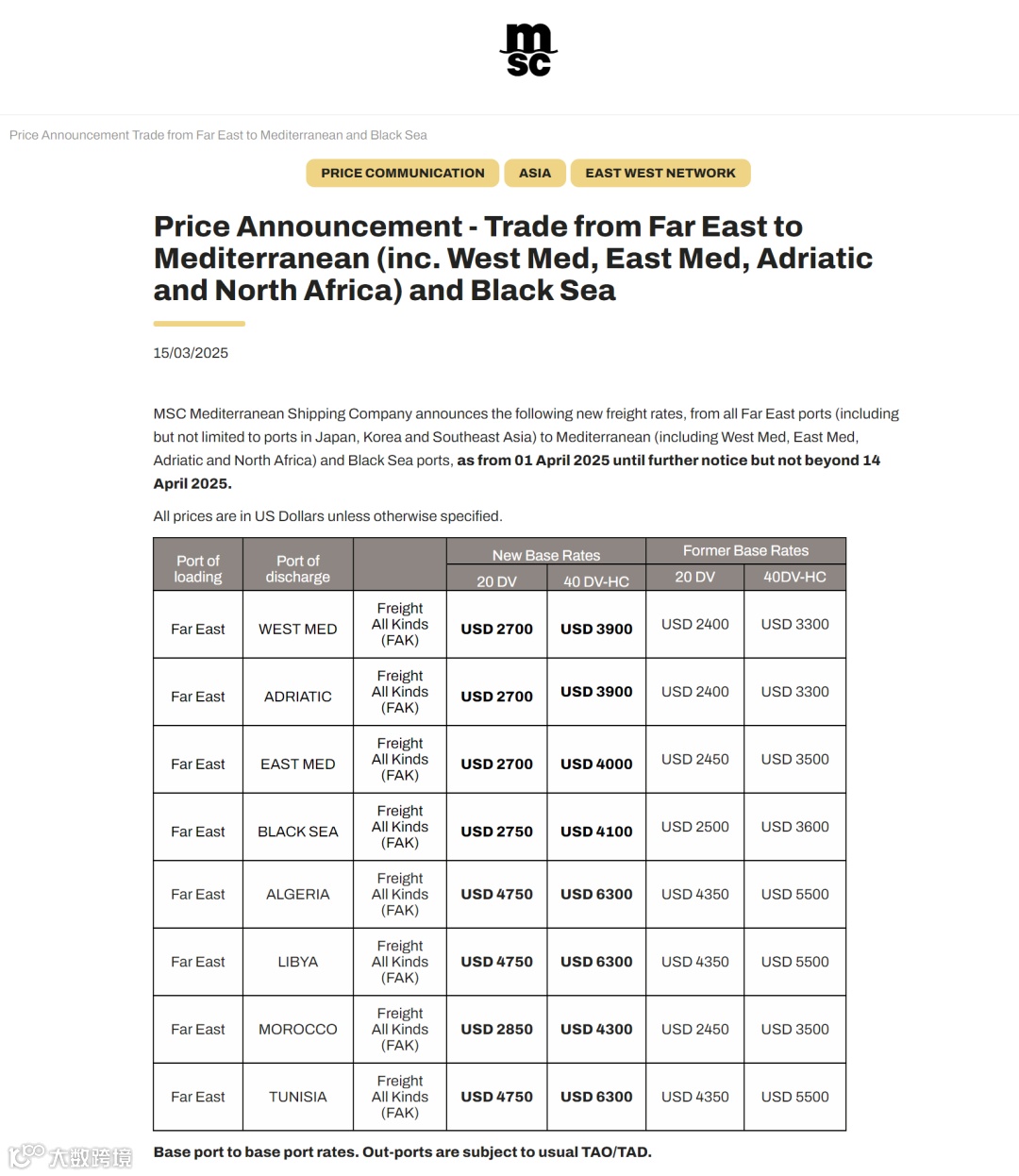 近日,MSC宣布从所有远东港口(包括但不限于日本、韩国和东南亚的港口)到地中海(包括西地中海、东地中海、亚得里亚海和北非)和黑海港口的新FAK费率。自2025年4月1日起生效,但不超过2025年4月14日。