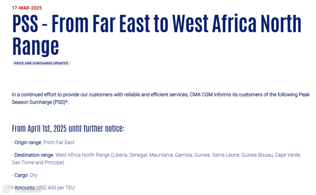 此外,达飞还发布公告,自2025年4月1日起,直至另行通知,从远东到西非北部征收 400 美金/TEU 的旺季附加费PSS。详情如下: