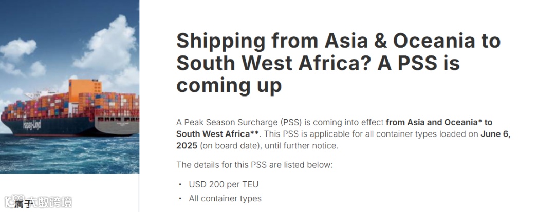 5月23日,赫伯罗特发布公告,征收从亚洲和大洋洲至西南非、中西非和西北非的旺季附加费 (PSS) ,适用于2025年6月6日(装船日期)装运的所有集装箱类型,直至另行通知。