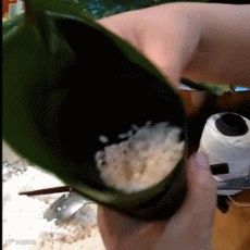 4、上部的粽叶向下折,直到完全盖住糯米为止。
