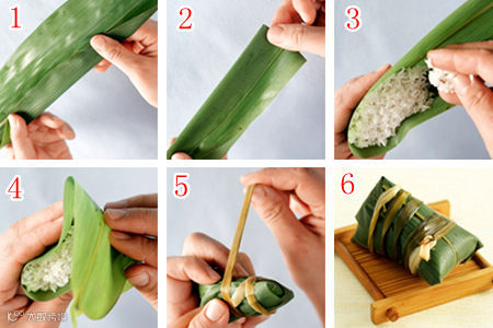 4.再顺着三角的边将所有的粽叶都折好,包的过程中手一定不能松,用绳子在粽腰处扎紧打结。