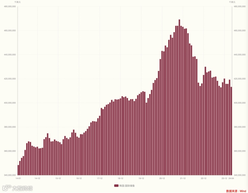当地时间5月7日,韩国央行最新公布的数据显示,截至今年4月底,韩国外汇储备规模为4132.6亿美元,环比减少59.9亿美元,创下了19个月以来的最大降幅。韩国央行表示,外汇储备缩水的原因是采取市场稳定措施。