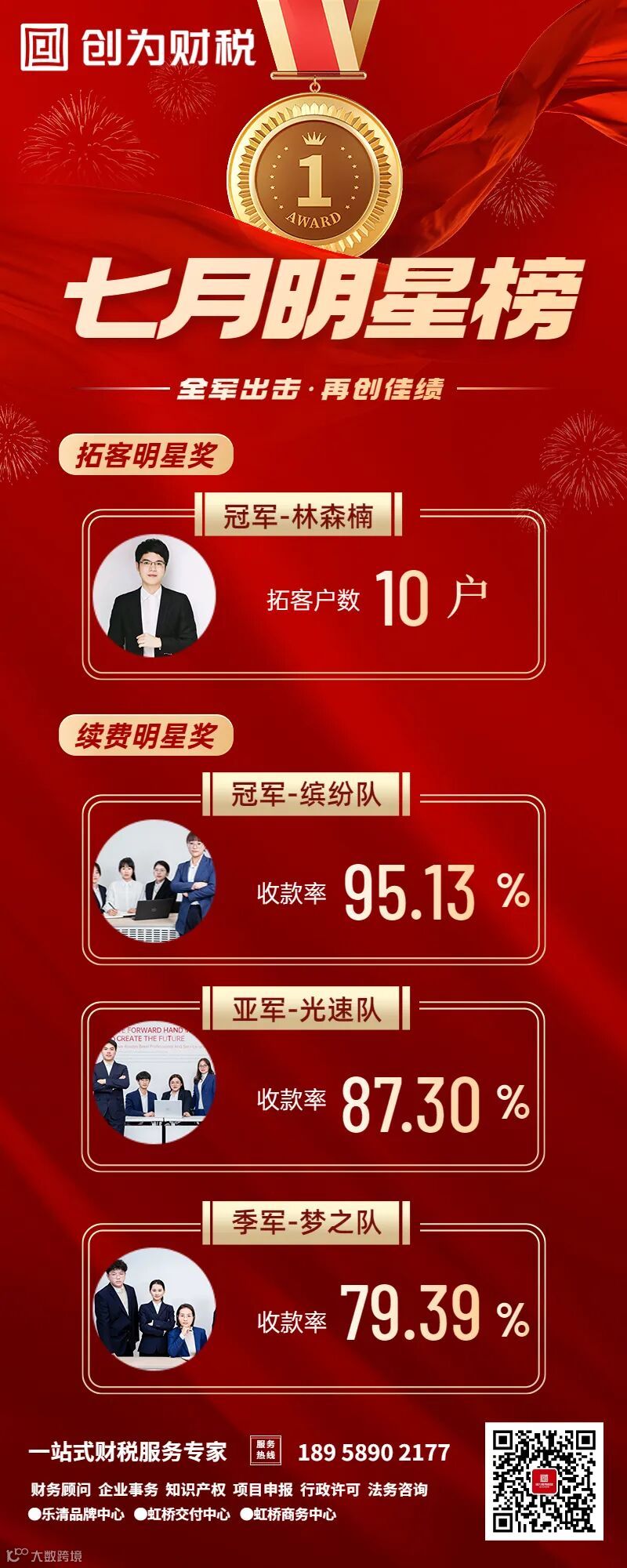 创为财税能取得如此优异的成绩,离不开优秀员工的积极进取和奋勇拼搏。为明确公司奖励的依据、标准及程序,形成良好的激励机制,激发员工的积极性和创造性,创为财税新设立《拓客明星奖》《续费明星奖》《服务明星奖》三大明星奖项,并于7月起正式施行。