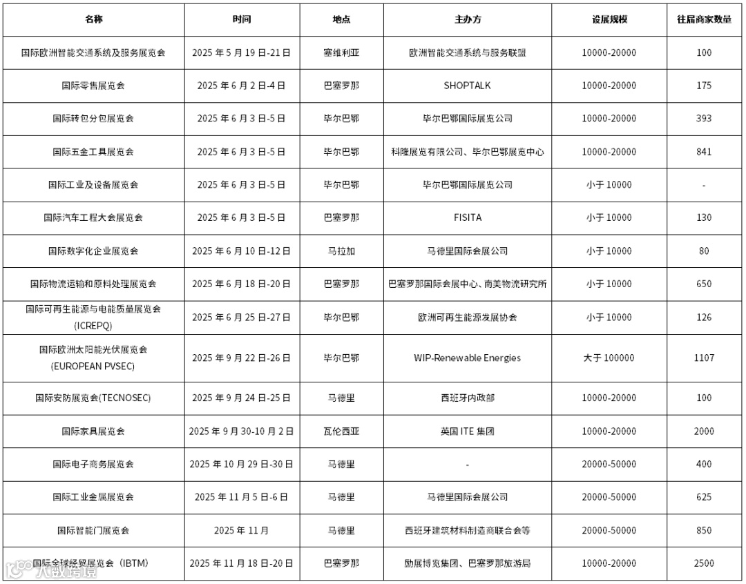 2025至2026年,西班牙计划组织约179场展会,主要举办地在马德里和巴塞罗那,涉及行业包括食品/果蔬/饮料/酒(17场)、建材/石材/照明/暖通(15场)、化工/环保/能源(14场)、机械/五金/工业(14场)、办公/礼品/消费品/玩具(12场)。其中影响力较大的是每年3月举办的巴塞罗那世界移动通信大会。2025年第二季度,值得关注的展会有西班牙巴塞罗那国际零售展览会(SHOPTALK EUROPE),将于2025年6月2日至4日在巴塞罗那举办;国际五金工具展览会,将于6月3日-5日在毕尔巴鄂举办。