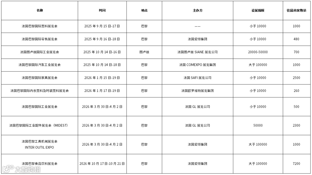 2025至2026年,法国计划组织超过300场各类展会,主要举办地在巴黎、图卢兹等地,涉及行业包括食品/果蔬/饮料/酒(36场)、建材/石材/照明/暖通(28场)、化工/环保/能源(28场)、计算机/软件/网络(25场)、酒店/餐饮/旅游(23场)。其中,影响力较大的包括法国巴黎国际面料展览会,将于2025年9月15日-17日在巴黎举办;法国巴黎国际零售展览会,将于2025年9月16日-18日在巴黎举办;法国图卢兹国际工业展览会,将于2025年10月14日-16日在图卢兹举办;法国巴黎国际工业配件展览会(MIDEST),将于2026年3月30日-4月2日在巴黎举办。