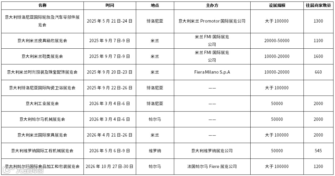 2025至2026年,意大利计划组织超过250场各类展会,主要举办地在米兰、博洛尼亚、帕尔马等地,涉及行业包括建材/石材/照明/暖通(30场)、纺织/服饰/鞋革(25场)、食品/果蔬/饮料/酒(24场)、化工/环保/能源(19场)、珠宝/首饰/美容/眼镜(17场)。其中,影响力较大的包括意大利米兰皮具箱包展览会及鞋类展览会,两场展会均将于2025年9月7日-9日在米兰举办;意大利工业展览会,将于2026年3月4日-6日在博洛尼亚举办;意大利米兰国际家具展览会,将于2026年4月21日-26日在米兰举办。