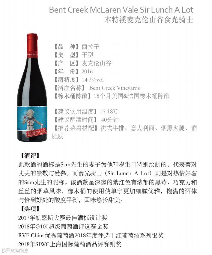 兰尼斯特旗下的五星名庄Bent Creek Vineyard本特溪酒庄和Di Fabio Estate迪法碧欧酒庄均位于此产区。课堂上Harrison老师用本特溪酒庄2014 Sir Lunch A Lot Shiraz食光骑士西拉子干红为例,为大家详细讲解了该产区酒品的特色。