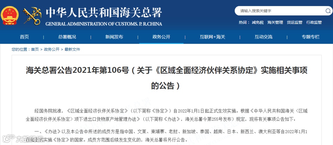 经国务院批准,《区域全面经济伙伴关系协定》(以下简称《协定》)自2022年1月1日起正式生效实施。根据《中华人民共和国海关〈区域全面经济伙伴关系协定〉项下进出口货物原产地管理办法》(以下简称《办法》,海关总署令第255号发布)规定,现将有关事项公告如下: