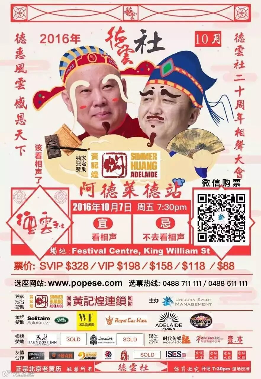 如今德云社成立20周年,澳洲巡演阿德莱德站将于10月7日正式开启,届时郭德纲携众弟子前来阿德为您带来不一样的笑料。作为银牌赞助方的兰尼斯特预祝德云社二十周年相声大会圆满成功!