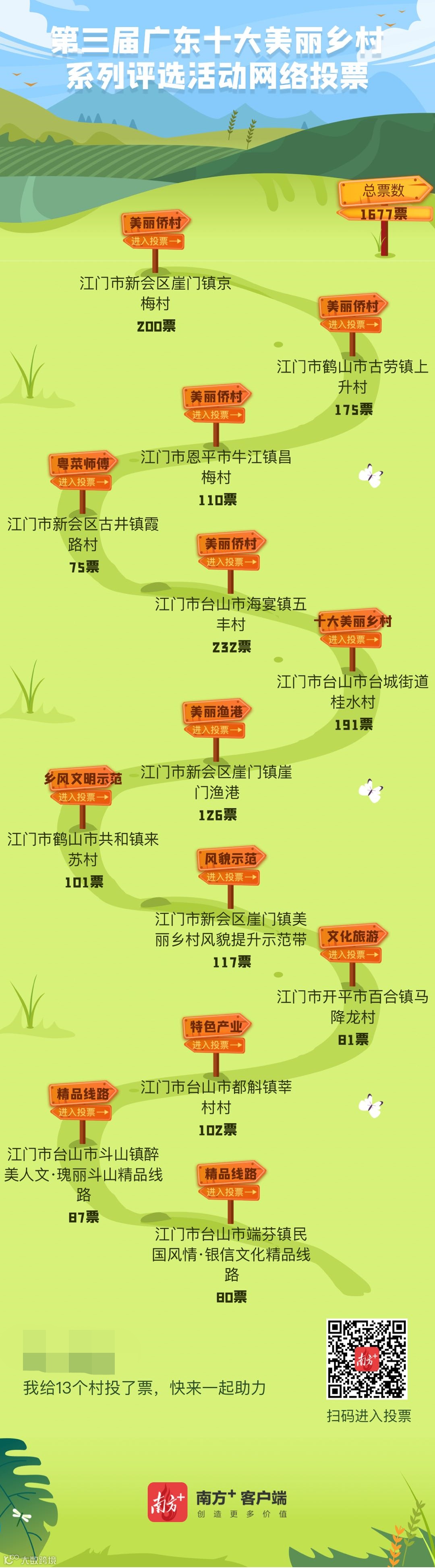每人(每个账号)每天最高可投120票,可投10条“广东十大美丽乡村”、10条“广东美丽乡村风貌提升示范带”、20条“广东美丽乡村精品线路”,以及“广东特色产业名村”“广东粤菜师傅名村”“广东文化旅游名村”“广东万企兴万村名村”“广东乡风文明示范村”“广东特色民宿名村”“广东美丽渔港”“广东美丽侨村”各10条。