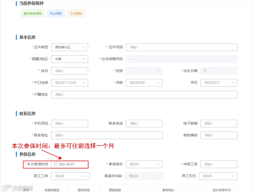 3.职工增加规则:养老保险和失业保险可从办理的上月或者当月开始参保,工伤保险系统默认为当月参保。