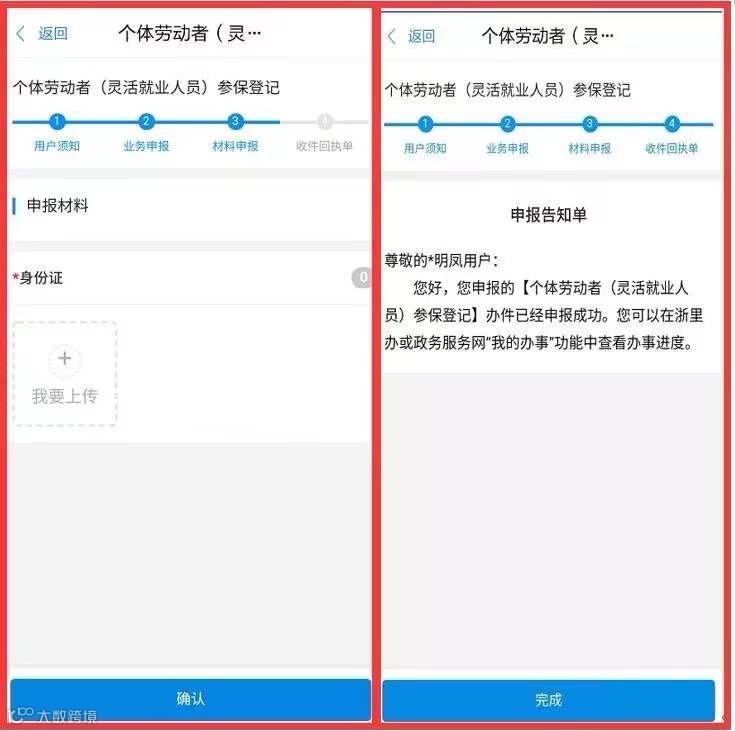 事项申报页面分为“用户须知、业务申报、材料申报、收件回执单”四个步骤操作,根据参保状态分为以下两种具体情形:
