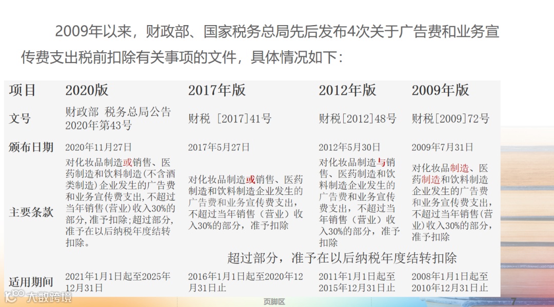 一、对化妆品制造或销售、医药制造和饮料制造(不含酒类制造)企业发生的广告费和业务宣传费支出,不超过当年销售(营业)收入30%的部分,准予扣除;超过部分,准予在以后纳税年度结转扣除。