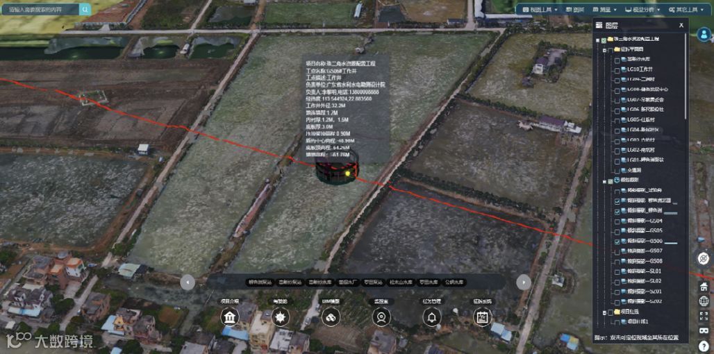 目前,珠三角水资源配置工程BIM+GIS数字化平台搭建并融合了全线3座泵站、90多公里长地下盾构管道、30多座工作井及高位水池全专业BIM模型,以及100公里长20公里宽的四层GIS模型(在线地图+高清卫片+倾斜摄影模型+TIN地形)。