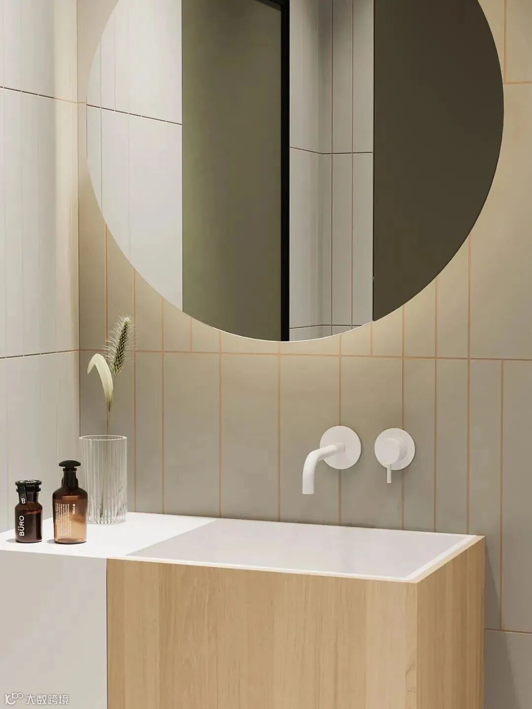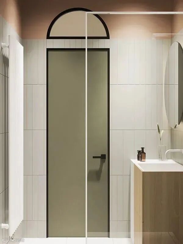 通往主卧的浴室用一扇复古绿的门作为引导,打开之后进入了一个经典时尚的摩登空间。设计师在浴室狭小的面积基础上用一堵薄壁隔开了两个干湿分离的空间。