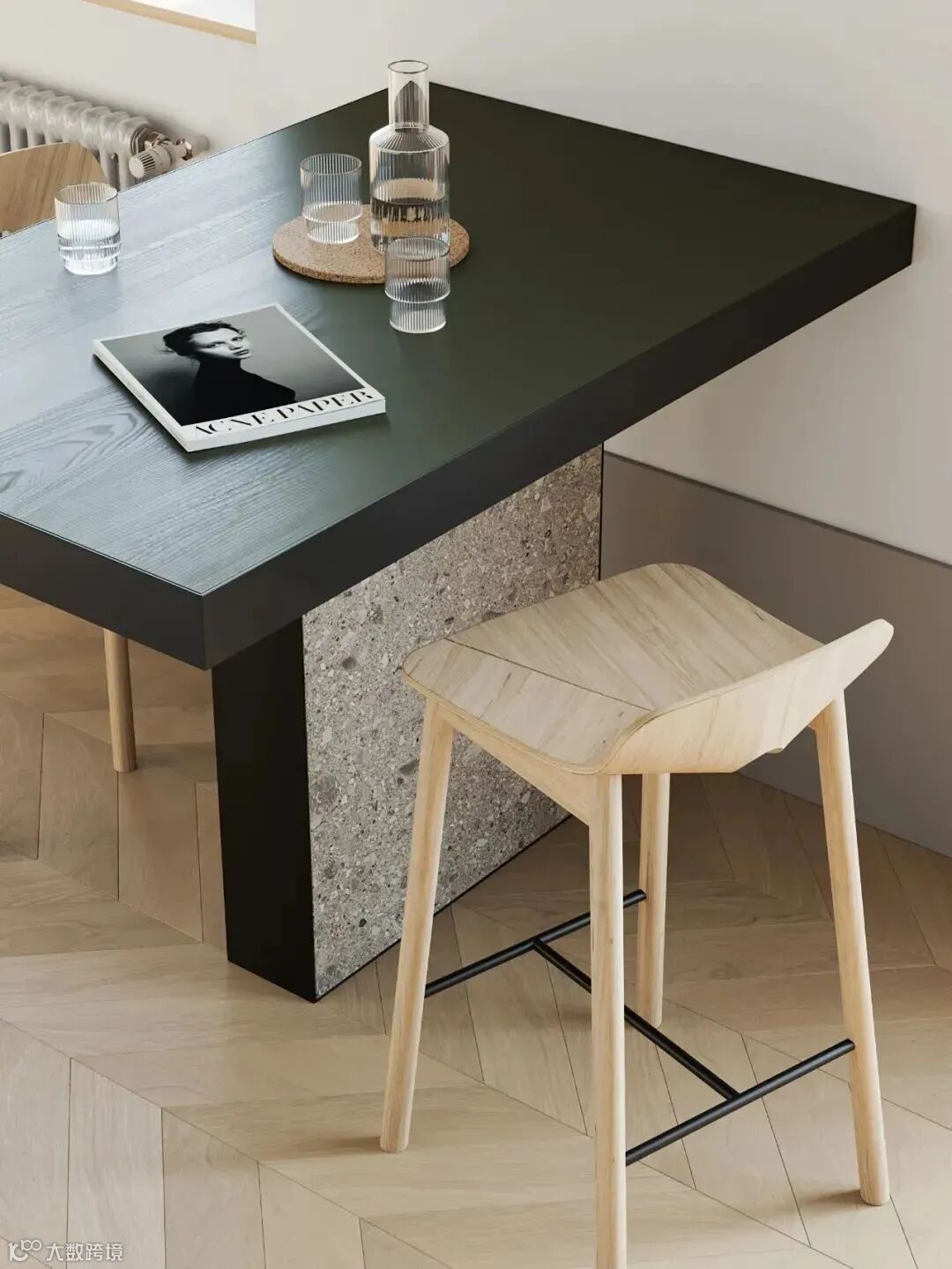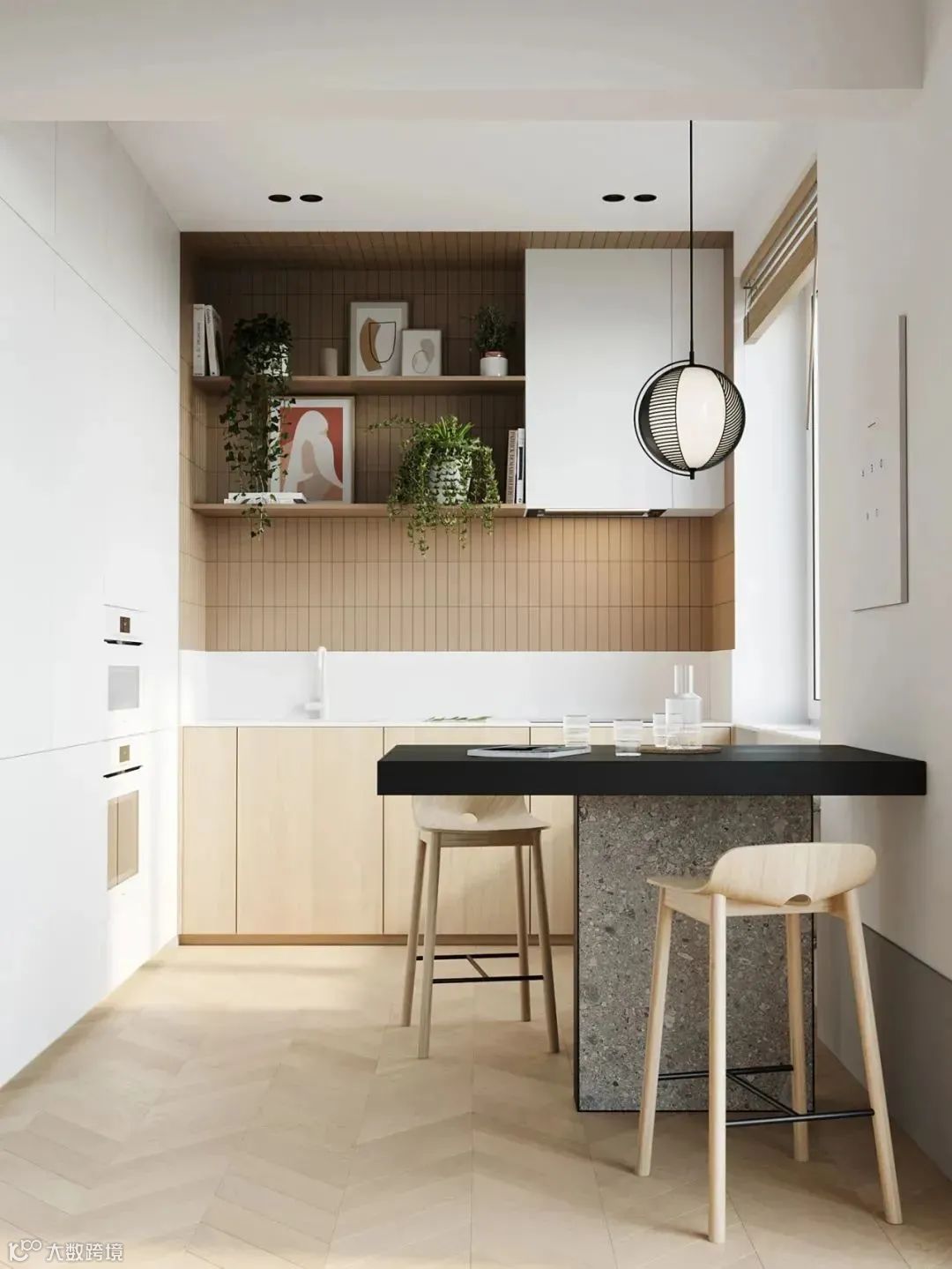 厨房角落划分的精致小巧,黑色水磨石纹理餐桌融入原木色彩中,治愈感满满。