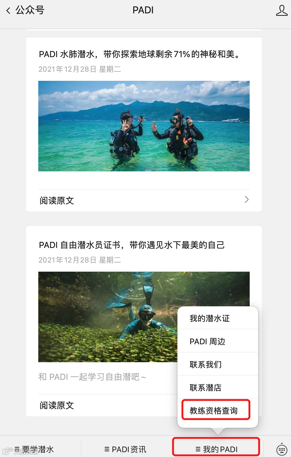 进入 PADI 公众号 → 点击菜单栏中的“我的 PADI ” → 点击“教练资格查询”