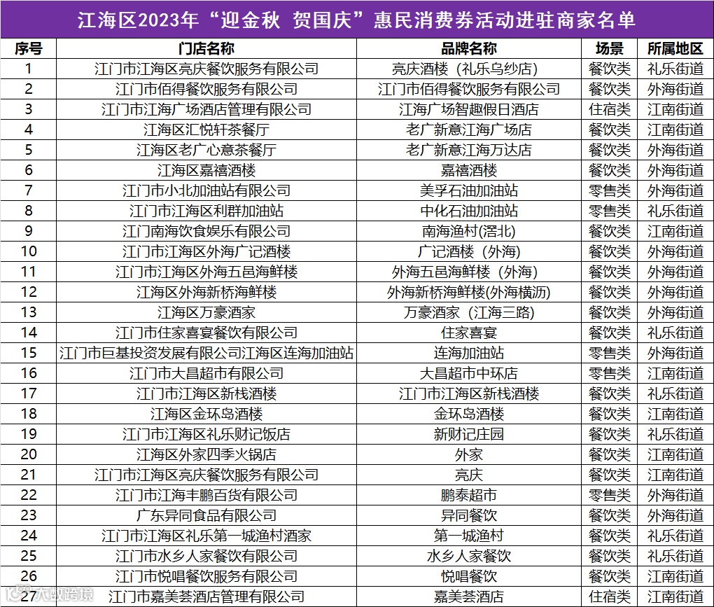 备注:本次消费券活动仅限江海区纳统限上批零住餐商家(含总部在江门市的),如本年度月度入统的可随时进驻。
