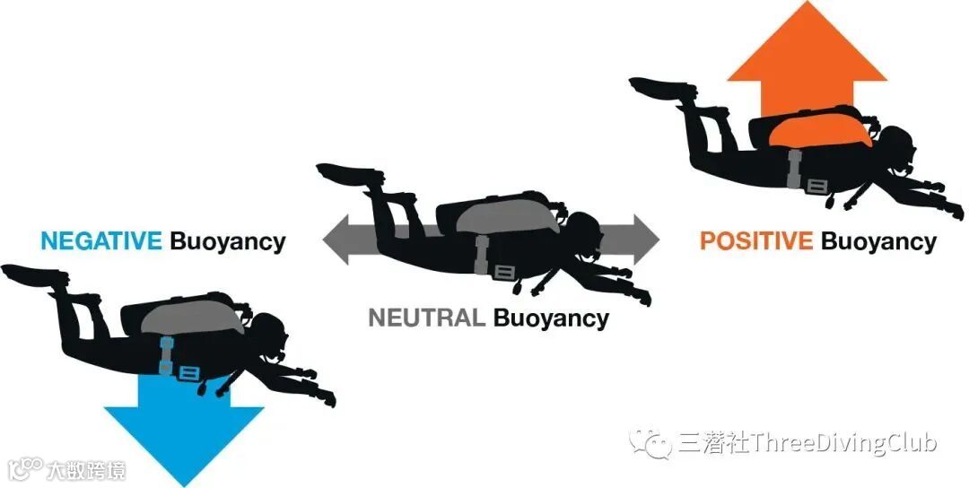 上图左是会浮起来的东西,比如潜水服、橡胶头套、浮力控制装置(BCD)等以及潜水员(人体的密度大致为1.02,水的密度为1,海水的密度为1.02-1.07)。这些统称为正浮力,其中BCD的正浮力会随充气量改变,潜水员的正浮力会随呼吸改变。