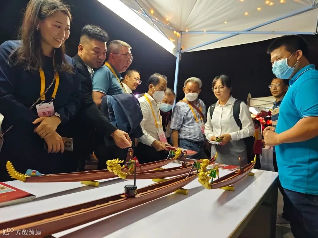 釜山公园的非遗文创展示区,整齐排列着八个摊位,向嘉宾们展示具有江门本土特色的文化工艺品,包括礼乐龙舟、生恭鲤鱼、梁氏木雕、台山玉石等。