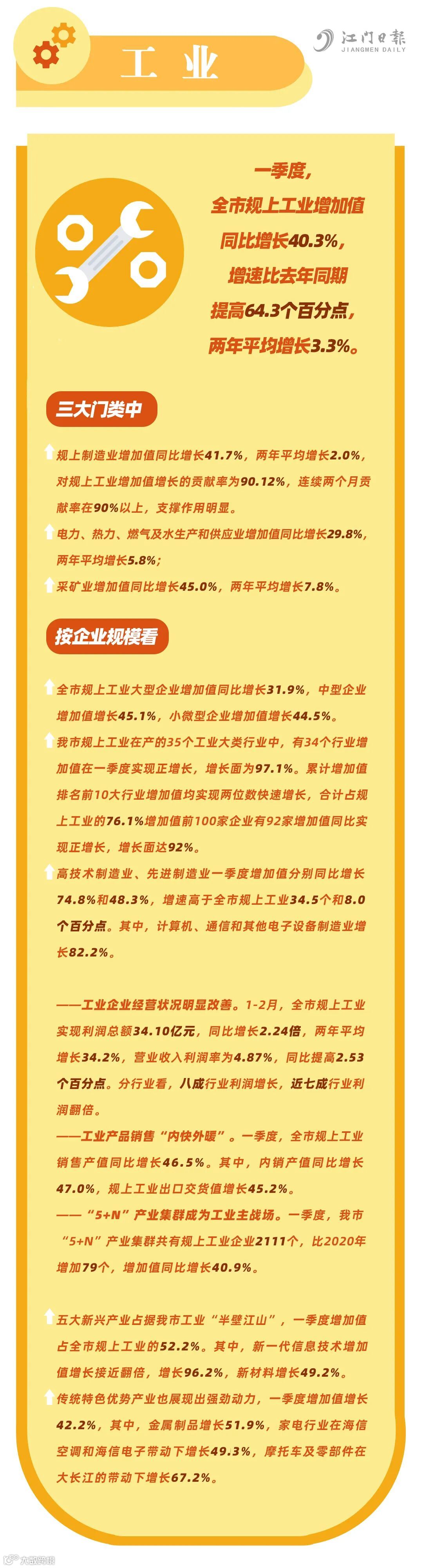 多年来始终以“工业立市”的江门,面对疫情和外部环境的冲击专心操持好“家业”,在“十四五”开局之年交出了一份亮眼答卷:一季度,全市规上工业增加值同比增长40.3%,增速比去年同期提高64.3个百分点,两年平均增长3.3%。其中,3月增加值增长24.8%。
